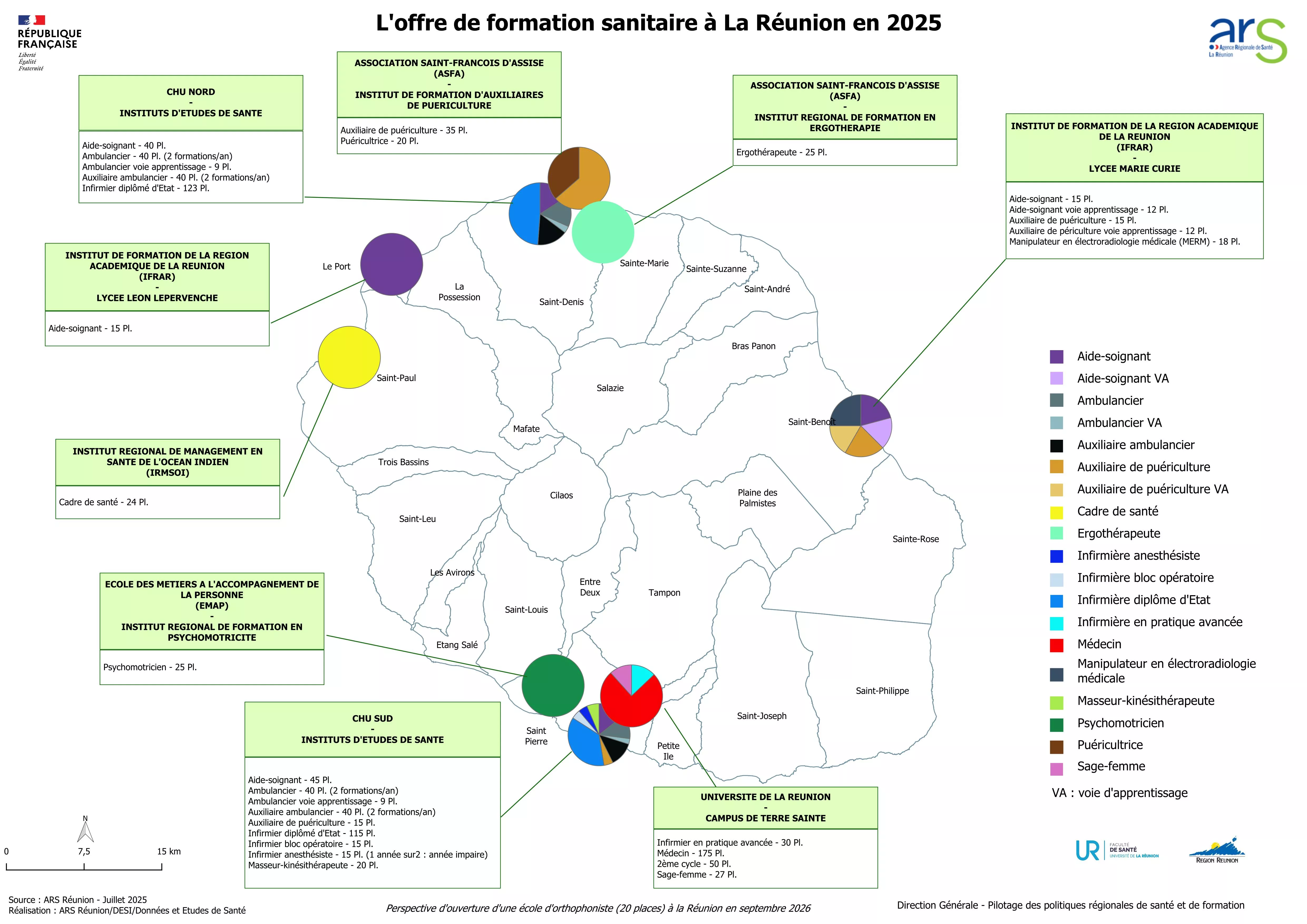 Vous trouverez ici l’offre de formation sanitaire dispensée à La Réunion en 2025 ainsi que le nombre de places autorisées et la répartition géographique sur le territoire.