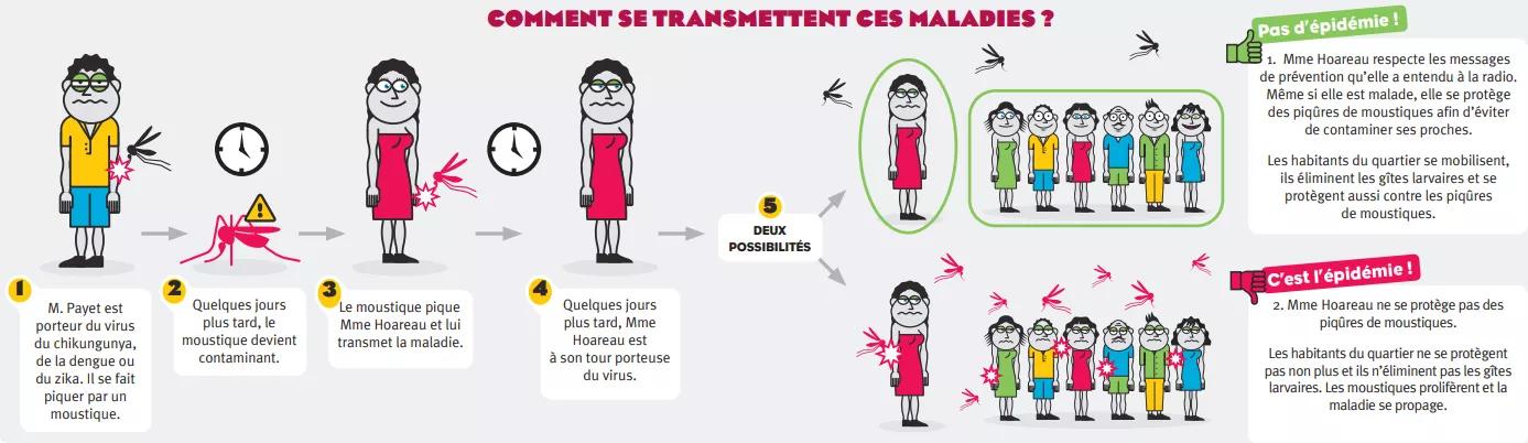 - Le moustique contaminé pique Mme Hoareau et lui transmet la maladie.